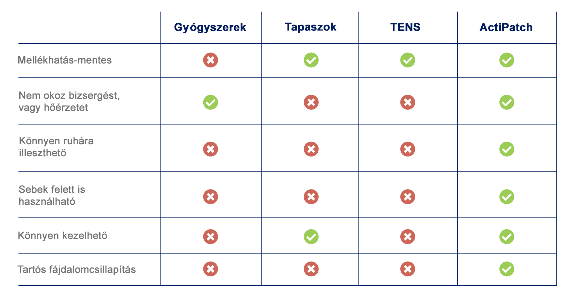 Az alábbi táblázatban összehasonlíthatja az ActiPatch előnyeit más módszerekkel szemben: